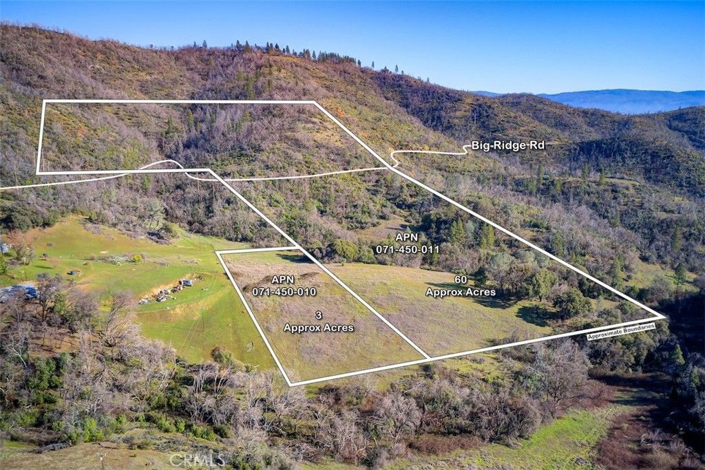 OWNER MAY CARRY: Just above the foothills surrounding Lake Oroville lies this expansive 63 acre property offering a rare blend of size, elevation, privacy, and diverse mountainous terrain. The land consists of two legal parcels; a 60-acre tract plus an additional 3 acre parcel providing flexibility for future use or long term planning. Elevations range from approximately 1,880 feet in the lower meadow areas to 2,200+/- feet at the upper reaches, creating dramatic changes in landscape and viewpoint. An old road weaves through the property, climbing toward the upper ridgeline where panoramic 360-degree views open up across surrounding mountains, rolling terrain, and even a potential distant lake view. This is an engaging and dynamic parcel with mixed topography, natural runoff ravines, and abundant land to explore. The area is known for its rich outdoor heritage with the Oroville region having a long history tied to gold prospecting, recreation, and backcountry living. The setting offers exceptional privacy once you are on the land, making it well suited for those seeking space, quiet, and separation from the everyday world. The property also presents strong potential as a recreational or hunting tract, with ample acreage for outdoor pursuits, hiking, target practice in appropriate locations, and wildlife activity typical of the area. With its size and seclusion, it could serve as an ideal location for a cabin retreat, country home, or self-sustaining property, subject to buyer due diligence and local regulations. Power lines run just adjacent to the lower 3 acre parcel. From the base of Big Ridge Road, the property is approximately 12.2 miles from Lakeside Market for fuel, supplies, and basic amenities, with a short drive beyond into town. Seller may consider owner financing on the full 63 acres with a reasonable down payment and negotiated terms; contact your agent for additional details. A rare opportunity to acquire a large, private tract of land offering views, recreation, and the freedom to create something truly your own.
