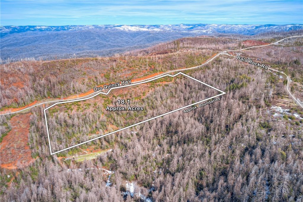 OWNER MAY CARRY: 18.1+/- Acres in the Sierra Foothills. Panoramic Mountain View parcel. A Fresh Start with Endless Potential opportunity nestled in the foothills just above the base of the Sierra Nevada mountains at approximately 3,200 feet in elevation. With an impressive 1,400+/- feet of frontage along Oroville Quincy Highway, this property offers excellent visibility and access in a serene mountain setting. Previously impacted by area fires, the land now presents a true blank slate with an open canvas where new growth is already emerging and young trees are beginning to reclaim the landscape. The natural regeneration creates a unique opportunity to shape the property to your vision, whether for a private retreat, recreational escape, etc. (Buyer to verify zoning and uses). An old, overgrown access road runs through the property, leading to a small pad area and several spots suitable for creative clearing. Galen Creek at the base of property. With no existing improvements, you have the freedom to design and build from the ground up with proper planning. Ideally located just a short drive from Lake Madrone and a scenic drive to Lake Oroville. Outdoor recreation at your fingertips. Boating, hunting, fishing, hiking, and year-round fresh mountain air. The property is zoned TM and sits approximately 1/3 mile below the upper Oroville Quincy/Bald Rock Road intersection. If coming from town, pass the first Oroville Quincy/Bald Rock intersection, if you reach the second intersection, youve gone just a bit too far. Offered at an affordable price point, this is your chance to own a substantial piece of Northern California foothill land and create something truly your own. Ask your agent on the easy owner carry terms available.