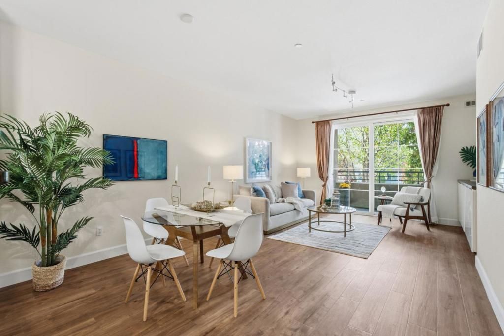 Refined 2BR/2BA in the sought-after Park Broadway community in Millbrae a - luxury condominium building first-floor home offering high ceilings, modern open floor plan, orientation along the Broadway side, providing both privacy and serene neighborhood views. 2 garage spots! The interior has been thoughtfully updated with new flooring and a fresh paint palette with modern color scheme. A contemporary kitchen with granite countertops and stainless steel appliances flows into an expansive living and dining area, designed for both entertaining and everyday living. A private balcony with additional storage extends the usable space & make this a most inviting home on the Peninsula! The primary suite boasts a walk-in closet and en-suite bath. Additional elements include a built-in office nook, in-unit laundry, central heat and air conditioning, and secured garage parking. The community features outdoor spa, the indoor fitness center, and an outdoor BBQ area! The location is close to Millbrae downtown corridor, ample dining and shopping options, as well as convenient access to BART, Caltrain, San Francisco International Airport, and major commuter routes - positioning this home as a well-balanced combination of design, volume, and connectivity.