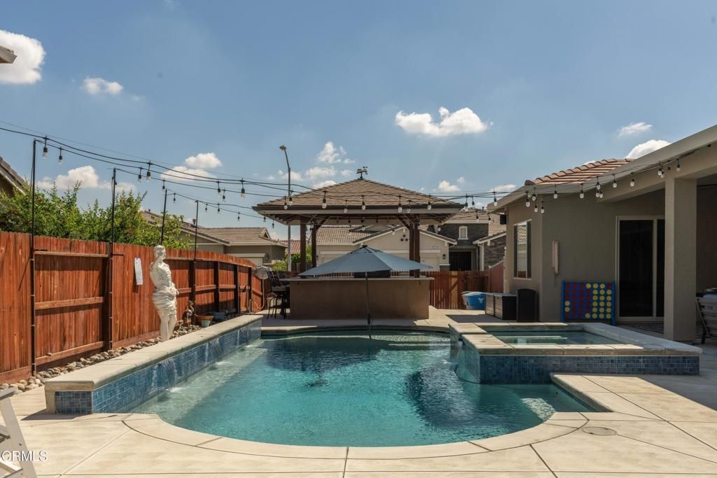 Stunning home in Stockdale River Ranch w/ unbelievable upgrades and high-end amenities. (See attached List). The open floorplan features a huge family room w/ tons of built-in cabinets, an impressive fireplace and double slider doors, plus a kitchen dining area, a formal dining room, and a game room/office. There is wood-look tile in most of the living areas, plantation shutters, crown molding, owned solar (w/ 58 panels and no true up) and a 4-car garage w/ epoxy flooring and a passthrough door. The gourmet kitchen includes a huge island w/ a sink, granite counters, decorative tile backsplash, Kitchen Aid appliances, double ovens, a walk-in pantry and more. You will love the additional prep kitchen. The highlight of the property is the backyard w/ a spacious covered patio, a sparkling saltwater pool and spa, an amazing outdoor kitchen and gazebo (w/ construction quality similar to the home) and a turf lawn. The relaxing master suite has all of the amenities you would expect.