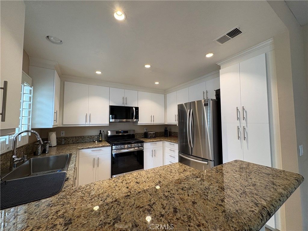Enjoy a resort-like lifestyle in the highly sought-after gated community of Canyon Villas in beautiful Aliso Viejo. This move-in ready second-story home features two spacious bedrooms and two bathrooms, offering comfort and flexibility for families, professionals, or anyone seeking a peaceful residential setting. The bright, open living room includes a cozy fireplace with mantle, wooden floors, and an abundance of windows that fill the space with natural light. The upgraded kitchen is a standout, showcasing gorgeous granite countertops, ample cabinetry, tile flooring, a breakfast counter, and new upscale appliances including a refrigerator, stove, dishwasher, and built-in microwave. Both bedrooms are light and airy with mirrored closet doors, while ceiling fans in the bedrooms and living area add to the homes comfort. Fresh paint throughout enhances the clean, inviting atmosphere, complemented by neutral tones and thoughtful upgrades. Ideally located within the gated community, the unit includes a one-car garage and an assigned parking space nearby. Residents of Canyon Villas enjoy access to two pools and two spas, and exceptional amenities, all just minutes from freeways and within walking distance to Aliso Viejo Town Centers shops, restaurants, and entertainment. Surrounded by top-rated schools, beautiful beaches, and scenic parks, this home perfectly blends convenience, relaxation, and an active lifestyle. Welcome to your dream rental!