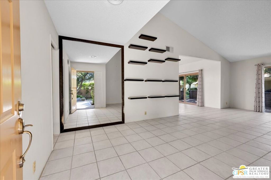 Welcome to Palm Springs Country Cluban iconic gated community designed by renowned mid-century architect William F. Cody where timeless design meets resort-style living. This 2-bedroom, 2-bath end-unit condo offers approximately 1,538 sq ft of interior space and is ideally located in Phase 5, one of the most desirable sections of the community. Being an end unit, it provides added privacy, abundant natural light, and convenient proximity to parking. The home features two spacious private patios, a rare and highly desirable setup. Enjoy stunning San Jacinto Mountain views from the west-facing patio, while the second patio opens to lush garden surroundings creating the perfect indoor-outdoor desert lifestyle. Inside, you will find soaring vaulted ceilings, a gas fireplace with tile surround, and an open-concept living space filled with natural light. The kitchen offers mid-century inspired design elements, including an island, wood cabinetry, stainless steel appliances, and a skylight that brightens the space throughout the day. Large sliding doors from both the living room and kitchen create seamless access to the patios. The primary suite is generously sized with direct patio access, mountain views, dual vanities, and a walk-in closet. A spacious guest bedroom also features patio access, complemented by a well-sized guest bath. Additional features include an in-unit washer and dryer with newer appliances. Palm Springs Country Club offers resort-style amenities, including beautifully landscaped grounds, a sparkling pool, spa, and included services such as water, and trash, all within a peaceful, well-maintained gated setting. This is a successor trust sale and presents a fantastic fixer opportunity to customize and add value within a historically significant mid-century community. With solid bones, a desirable layout, and an unbeatable setting, this unit is ready for your vision. Bring your ideas and make it your own, opportunities like this are rare, and the property is being sold as-is, where-is.