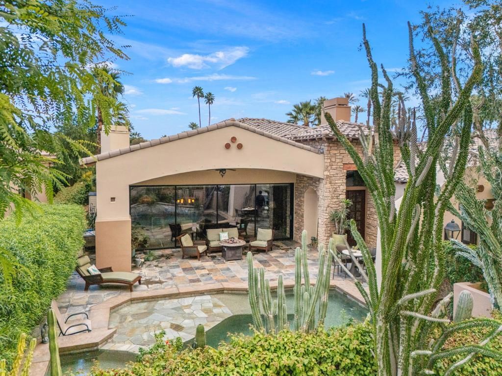 Welcome to serenity in La Quinta's Point Happy, where unobstructed western mountain views create a peaceful sanctuary setting.This stunning home seamlessly blends indoor and outdoor living. A dramatic wall of glass opens to a slate patio featuring a gorgeous private pool and spa with a cascade waterfall. Within the setting also exists gorgeous mature landscape. All perfectly positioned to take in the breathtaking mountain backdrop.Inside the residence offers 3 bedrooms with ensuite plus a designated office and showcases exceptional attention to detail throughout.Highlights include- Elegant Porcelain tile flooring, granite slab kitchen with premium Thermador stainless steel appliances, Spacious great room with built-in entertainment center and stone fireplace, custom window treatments, Luxurious primary suite with fire place and built in media center, Travertine primary bathroom with walk in shower and soaking tub, and private patios off 2 bedrooms.Every element of this home has been thoughtfully curated, and it shows like a model.Ideally located just minutes from fine grocery stores and delicious culinary experiences just outside the front door. Also, just minutes from the Valleys top attractions: Indian Wells Tennis Gardens, El Paseo, Old Town La Quinta, Coachella Valley festival grounds , Acrisure Arena, and the best golf courses in the area. The home is offered furnished with a generous inventory list.This is desert living at its finest- private, refined, and perfectly positioned near the best of the Coachella Valley