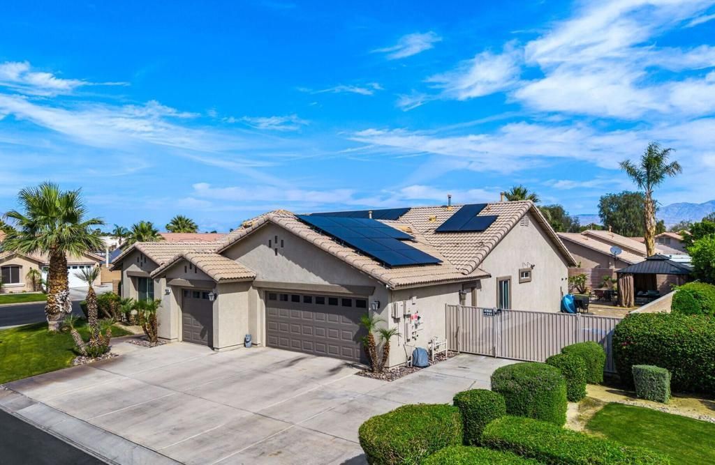 Situated on a desirable corner lot in Montecello II, this home offers comfort and versatility just two blocks from the La Quinta city limits. Thoughtfully designed, the property features vaulted ceilings, an inviting fireplace, expansive sliding glass doors, abundant natural light, and a spacious three-car garage with additional RV parking--perfect for all your lifestyle needs. As you approach the home, you'll pass the attached fourth bedroom/casita, complete with its own private entrance and bathroom--ideal for hosting out-of-town guests or creating a secluded home office. Inside, you're welcomed by an open-concept living and dining area with a seamless transition to the backyard, creating a bright and airy setting ideal for both everyday living and entertaining. The home showcases numerous upgrades throughout, including granite countertops, stainless steel appliances, maple cabinetry, and a tasteful mix of laminate, wood, and carpet flooring. The expansive primary suite occupies its own private wing, featuring a large walk-in closet and a spacious en-suite bathroom for added comfort and privacy.Outside, the nicely landscaped yard is easy to maintain with gardening service included, allowing you to relax and enjoy your surroundings. This home offers the perfect blend of flexible living space and exceptional curb appeal--ready for you to move in and make it your own. Bonus: Owned Solar, Low HOA, and Located in IID for lower-cost electricity!